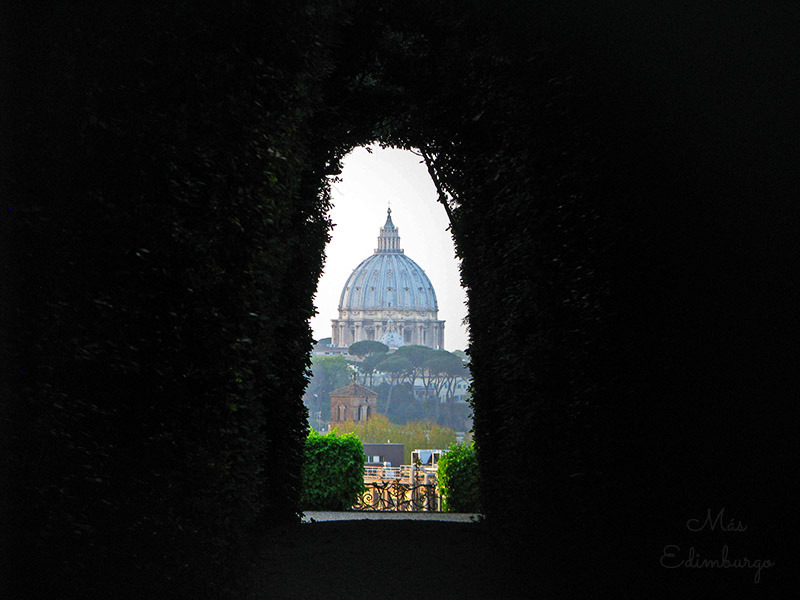 Este jardín aguarda secretos encantadores que dejó plasmados su arquitecto. En la puerta principal si observamos por la cerradura, se puede ver en un encuadre casi perfecto, entre cipreses, la cúpula de la Basílica de San Pedro.